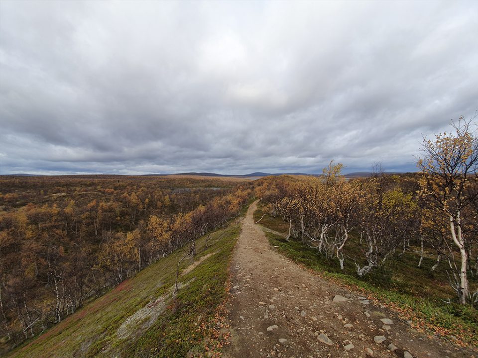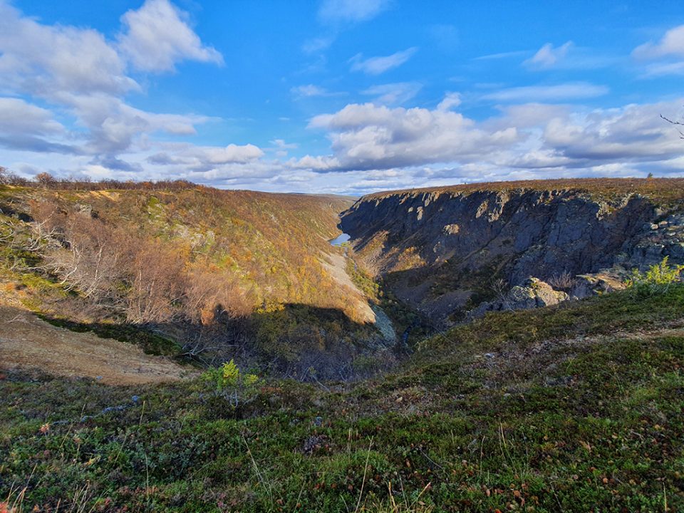 Hetken päästä vaeltaja pääseekin laskeutumaan alas kanjoniin Fiellun putoukselle, joka syksyllä ruskan aikaan on kuin keltainen paratiisi värien ja veden loistaessa auringon valossa. Täältä ei halua lähteä pois!