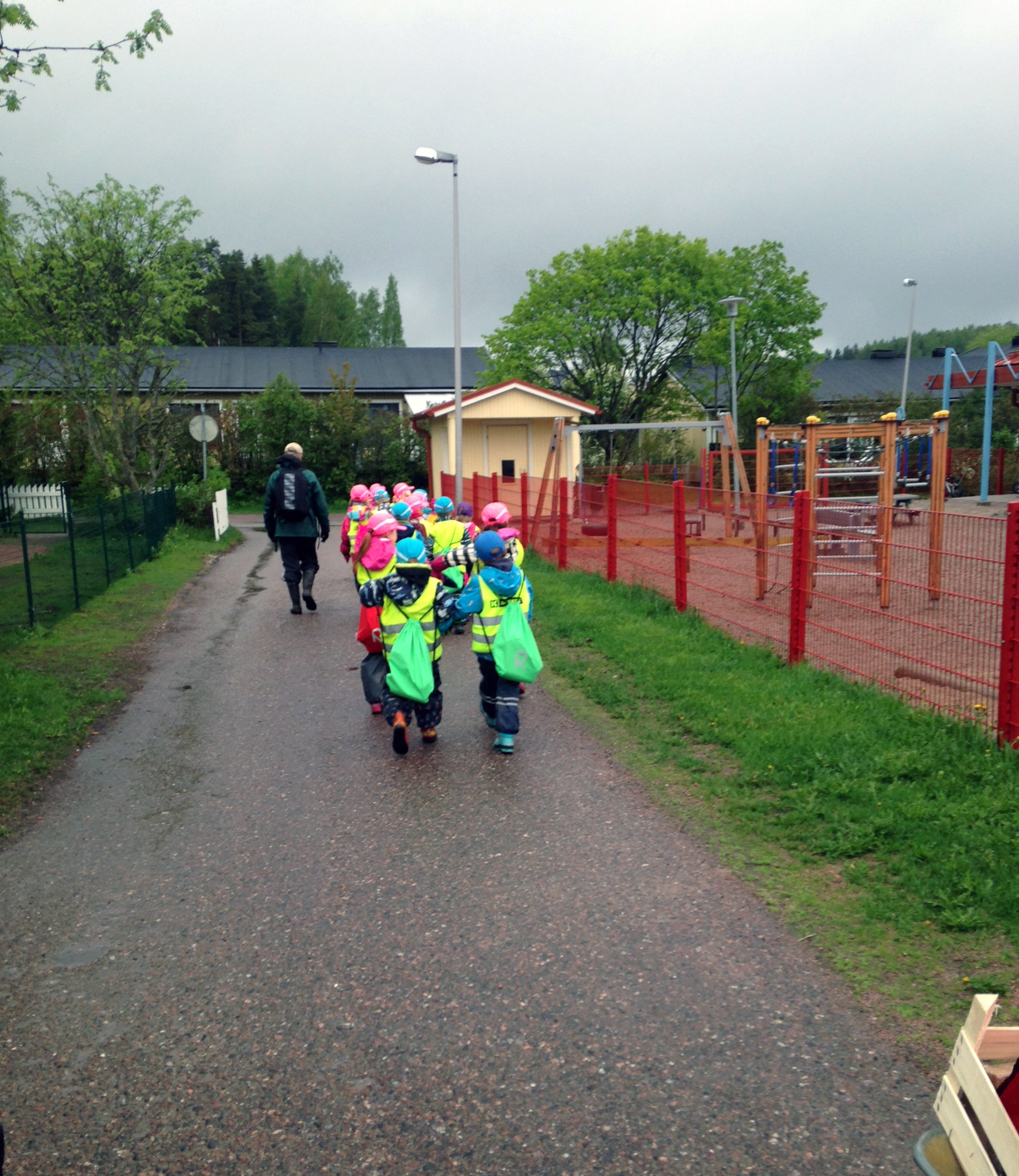 Päivä valkeni sateisena ja harmaana. Jostain syystä lapset olivat todella innoissaan sadesäästä. Tarkoittaahan se erilaista metsäseikkailua. Hieman närkästystä aiheutti vain kuravaatteiden päälle laitto, mutta siitäkin selvittiin jo rutiinilla.