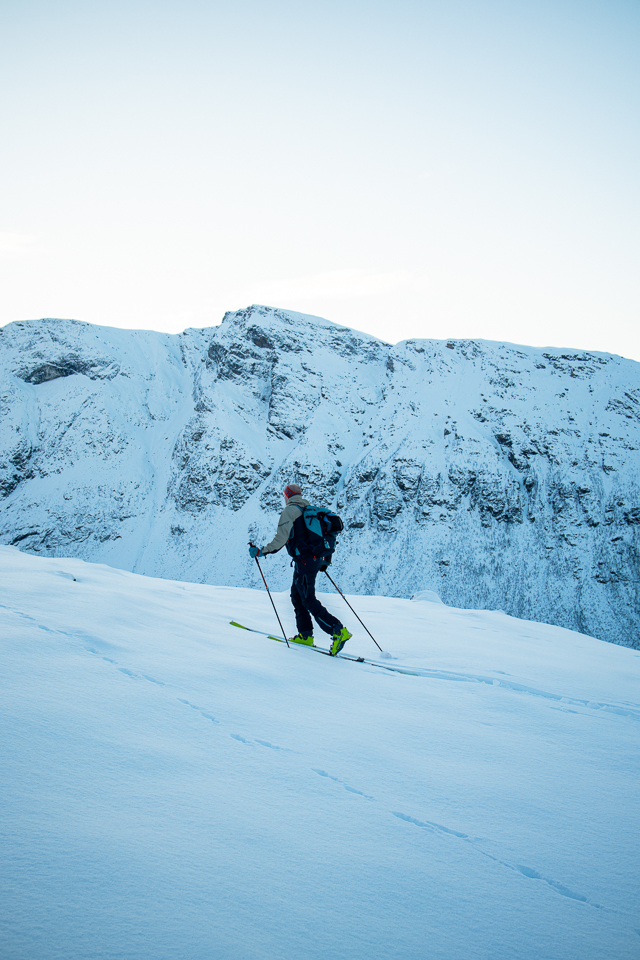 Asetin otsalampun kypärään valmiiksi, sillä hämärä hiipi vuonoa pitkin, emmekä tulisi kerkämään alas asti ennen pimeää.