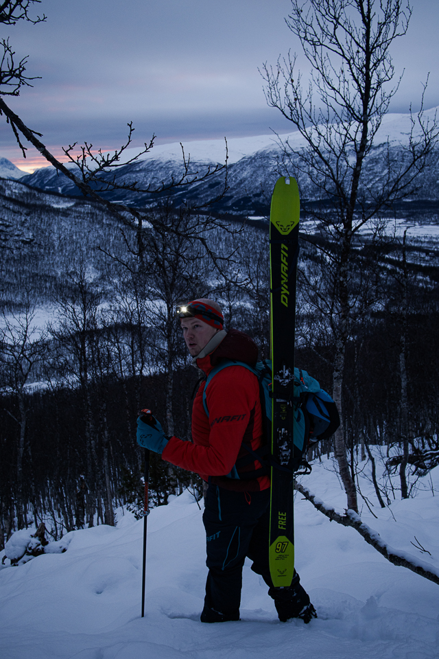Ensimmäiset testit lampulle tuli heti kauden toisen vapaalaskupäivän loppuosuudella, kun iltapäivä alkoi hämärtyä. Lumen määrä metsässä ei riittänyt alas laskemiseen, joten päädyttiin laittamaan sukset reppuun ja kävelemään alas tyypillisessä Norjalaisessa tihenevässä metsässä.