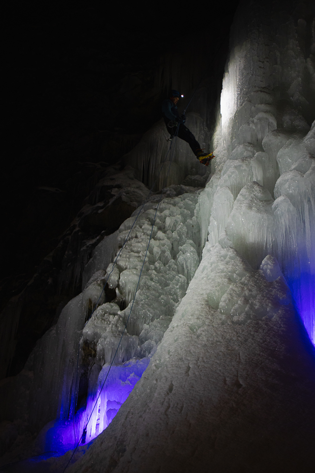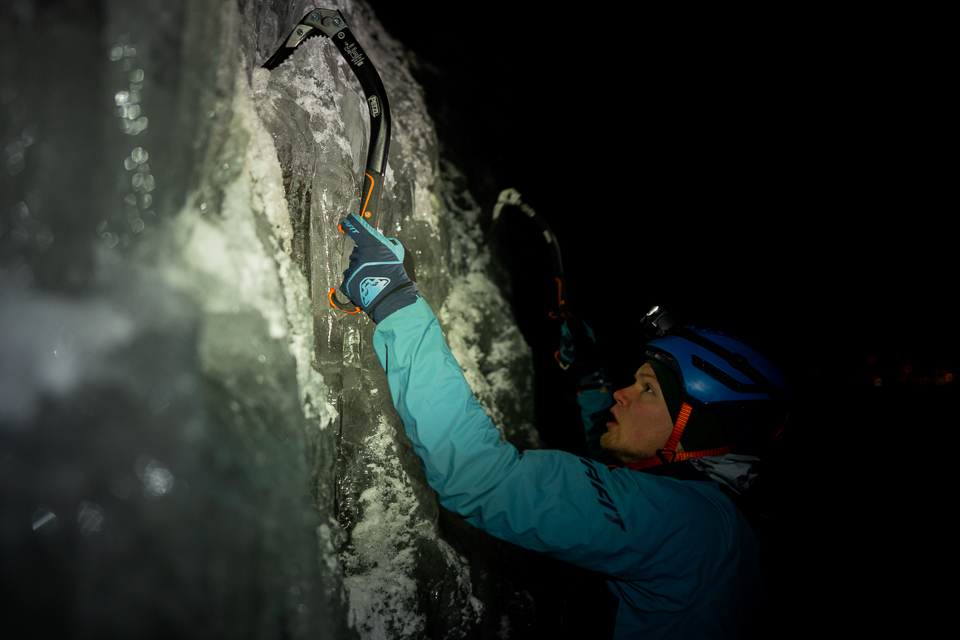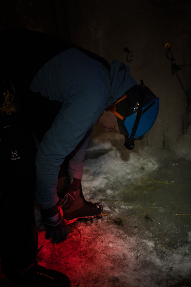 Kiivettiin myös muutamana iltana yläköydessä jääseinillä otsalamppujen valossa. Yläköydessä kiivetessä kiipesin punavalolla, sekä normaalilla valo asetuksella. Punavalolla kiipeäminen oli normaalia valoa miellyttävämpää ja säästi hämäränäköä.