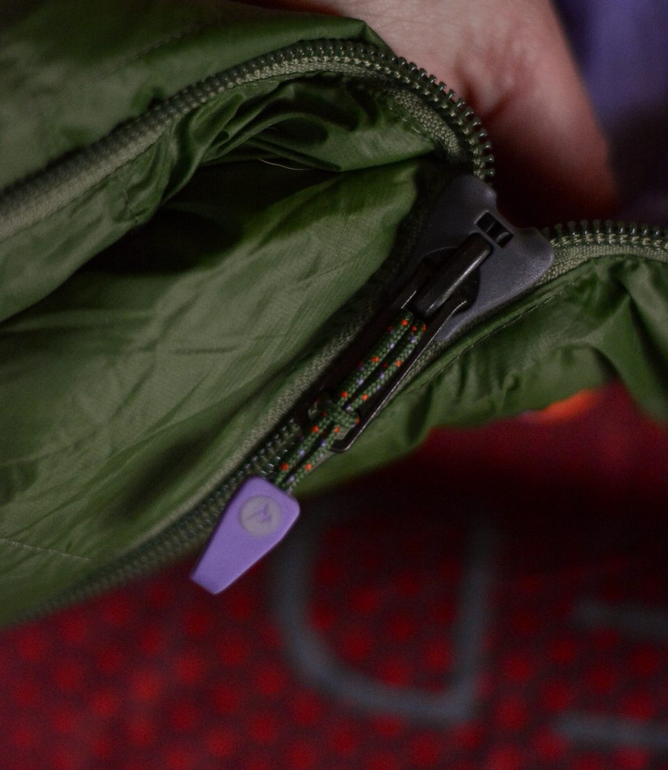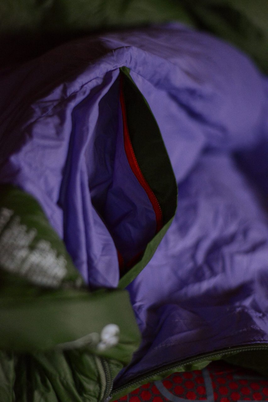 Sisäpuolella vasemmalla löytyy puhelimen mentävä vetoketjullinen säilytystasku – ei siis enää joka-aamuista ongelmaa makuupussissa seikkailevan puhelimen kanssa. Lisäksi vetoketjujen vetimet on muokattu sellaisiksi, ettei kangas jää niin helposti niiden väliin jumiin.