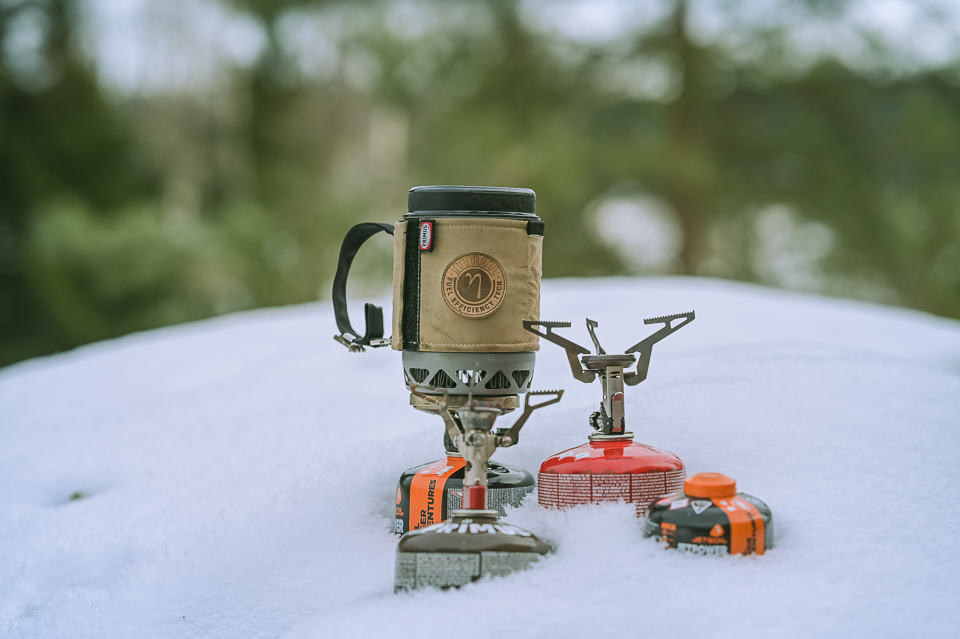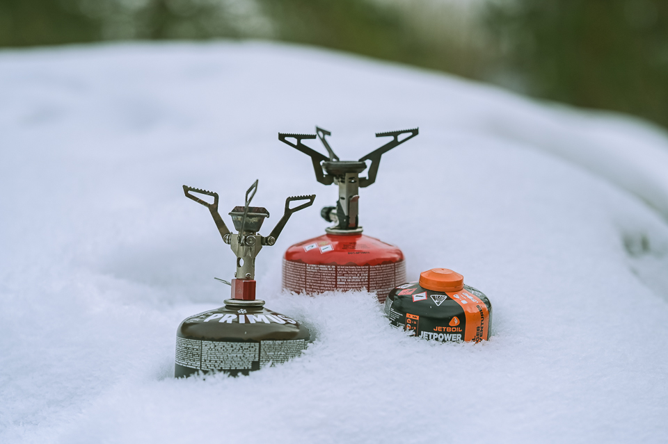 Käytimme MSR Pocket Rocket 2 ja Primus Lite Plus (testissä vanha malli) -kaasukeittimiä ja polttoaineena oli Primus Winter Gas 230 g ja Jetboil Jetpower 230 g. Keittimillä on iso ero tehossa ja ne eivät ole vertailukelpoisia keskenään, testin tarkoituksena olikin enemmän tarkastella kaasujen eroja. Kahdella keittimellä testiin saimme hiukan lisää tasoa, kun keittimissä on kuitenkin isoja eroja keskenään.