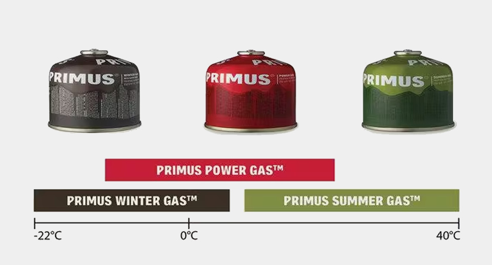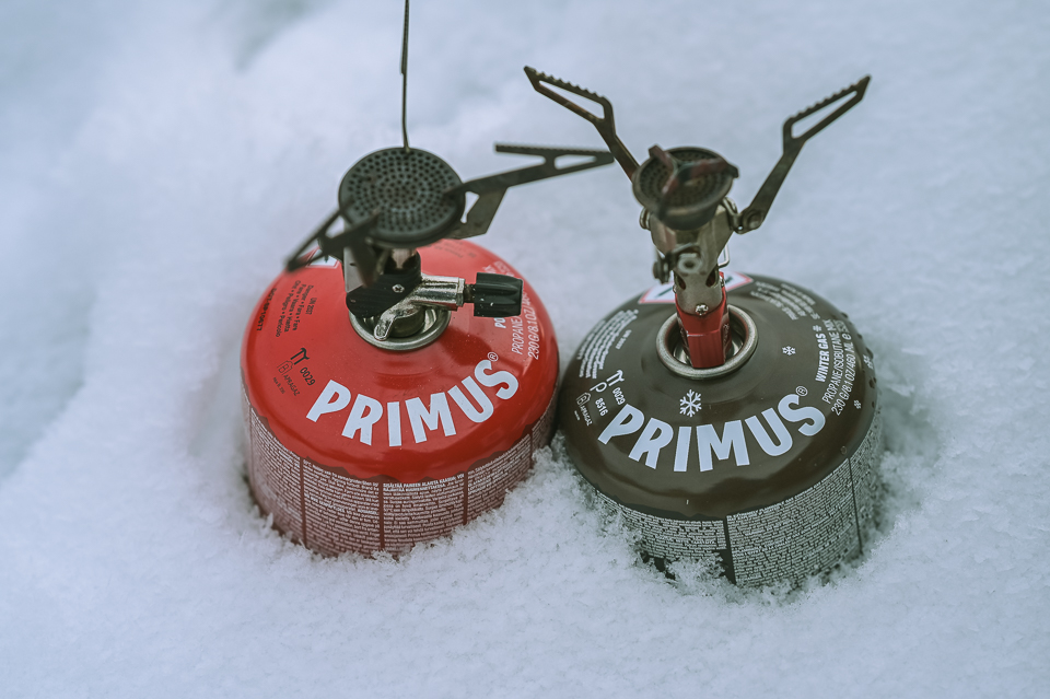 Primuksen kaasuvalikoimassa on erikseen kesäkaasu, Power Gas ja talvikaasu. Talvikaasulle luvataan -22 °C ja se pärjäsikin loistavasti vielä -19 °C pakkasilla.