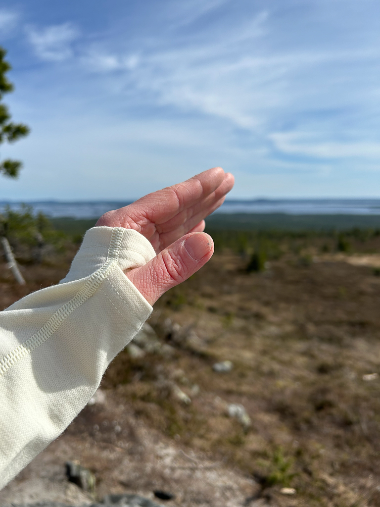 Kun kiersimme Riisitunturilla, niin huppari oli päälläni koko ajan. Lämpötilaan se oli juuri sopiva, sillä vaikka lämpöä oli varjossa +18 astetta ja aurinko paistoi, niin tuuli oli kylmä. Huppari oli loistava valinta. Hengitti hyvin, sillä oli mukava reippailla tunturilla ylös alas. Vaikka tuuli oli hiukan kylmä, en kaivannut mitä siihen päälle. Reippaillessa tuli myös hikoiltua siinä kiivetessä, niin siinä huomasi taas merinovillan loistavat ominaisuudet!