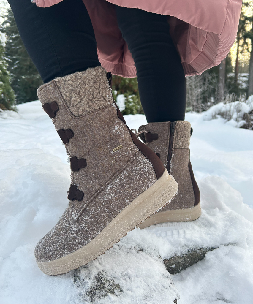 Olen Noora, Scandinavian Outdoor Pirkkalan myymäläpäällikkö ja sain testattavaksi Pomar Women’s Reki GTX -talvisaapikkaat. Odotin innolla testiä, sillä jalkani palelevat aina ja nyt tuotetiedoissa luvattiin paljon lämpöä ja mukavuutta!