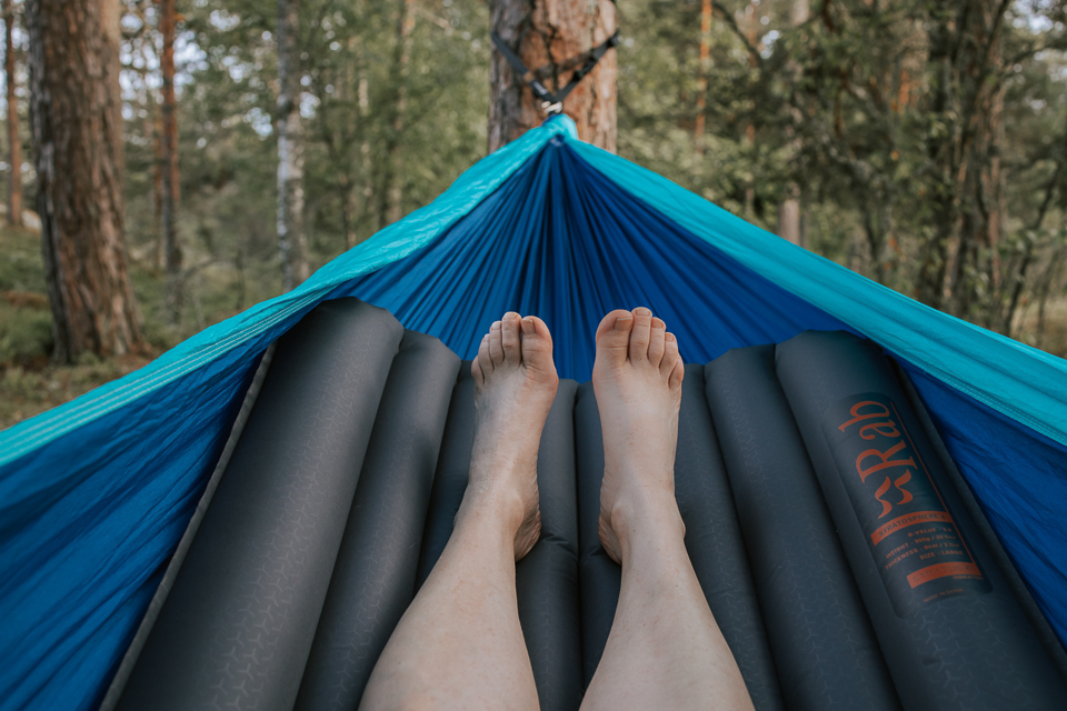 Riippukeinussakin patja toimi mainiosti. Leveytensä ja pituutensa ansiosta riippukeinu asettautuu parempaan asentoon ja selkäkipuisenkin oli siinä oikein mainiota pötkötellä – kumppanilla toimi paljon paremmin kuin teltassa. Patjan pyöristetyt kulmat sopivat hyvin riippukeinuun ja pitkittäin olevat ilmalokerot muodostivat riipparin kanssa yhdessä ihanan pesän minne käpertyä nukkumaan. Patja pysyi myös hyvin paikallaan ja helpotti sekä riippariin menoa, että sieltä poistumista. Huomiona tähän mainittakoon, että testissä käytössä ollut riippukeinu oli kahden hengen eli normaalia leveämpi.