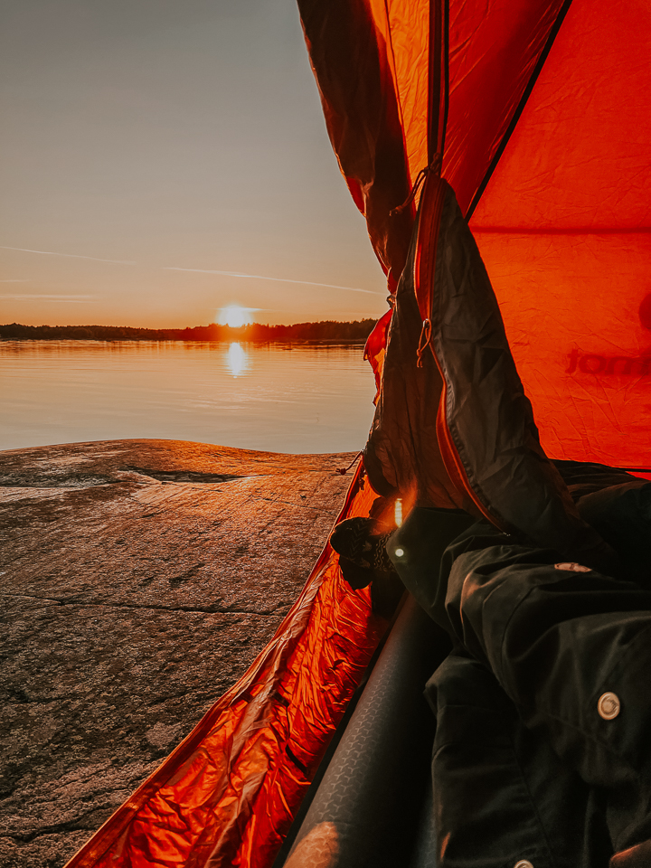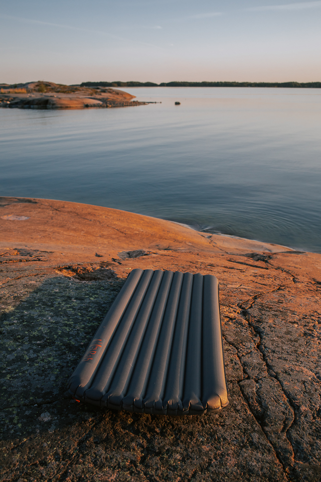 Stratophere pääsi mukaan saaristoon, jossa pystytin teltan sileille rantakallioille. Ahvenanmaan reissulla patjaa testattiin erittäin helteisissä olosuhteissa. Lisäksi patja toimi eristeenä ja mukavuuden tuojana riippukeinussa nukkuessa. Retkialustan täyttö sujuu kätevästi pumppupussilla. Pumppupussi voisi ehkä olla hitusen suurempi, mutta patja täyttyi silti parissa minuutissa.