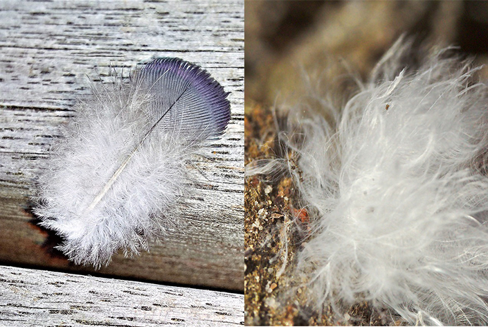 Vasemmalla on kuvassa höyhen, siinä on ruoto keskellä. Untuva on aines ilman ruotoa.