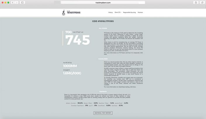 Track My Down näyttää myös untuvan eri ominaisuuksia ja tarkat laatuarvot kuten kyseisen takin Fill Power -arvon.