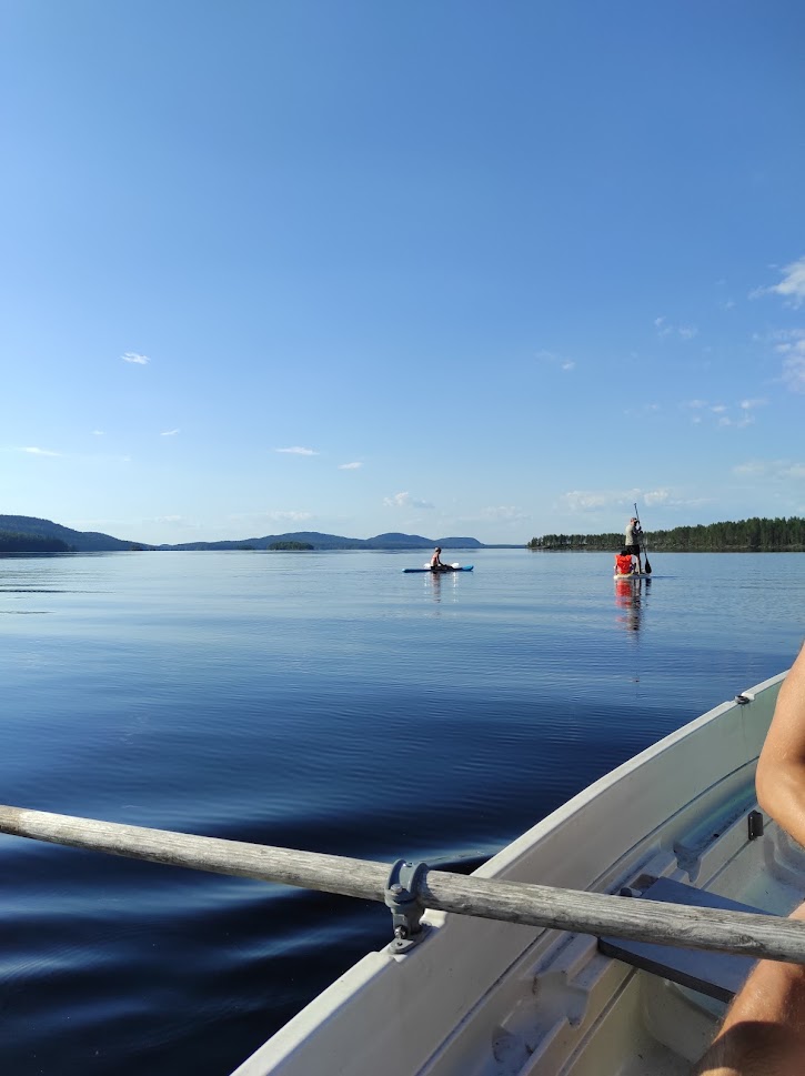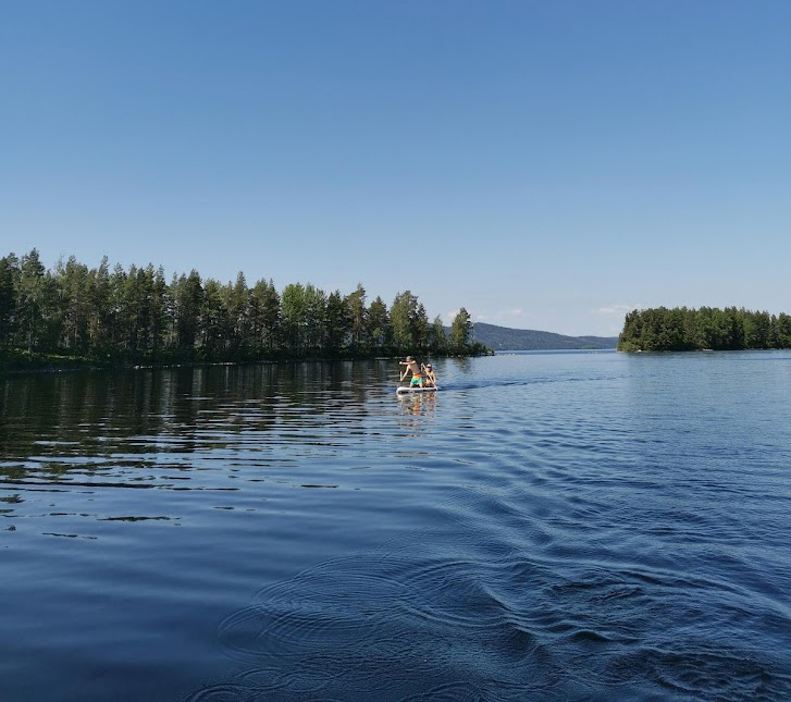 Muutaman päivän lomailtuamme mökillä päätimme lähteä tutkimaan järvellä näkyvien saarien salaisuuksia. Meillä oli kaksi sup-lautaa mukana – toki niitä olisi saanut Kolin ympäristöstä vuokratakin. Idean tähän seikkailuun saimme ihan karttaa katsomalla, saarten harjumainen muoto houkutteli tutkimusmatkaan.