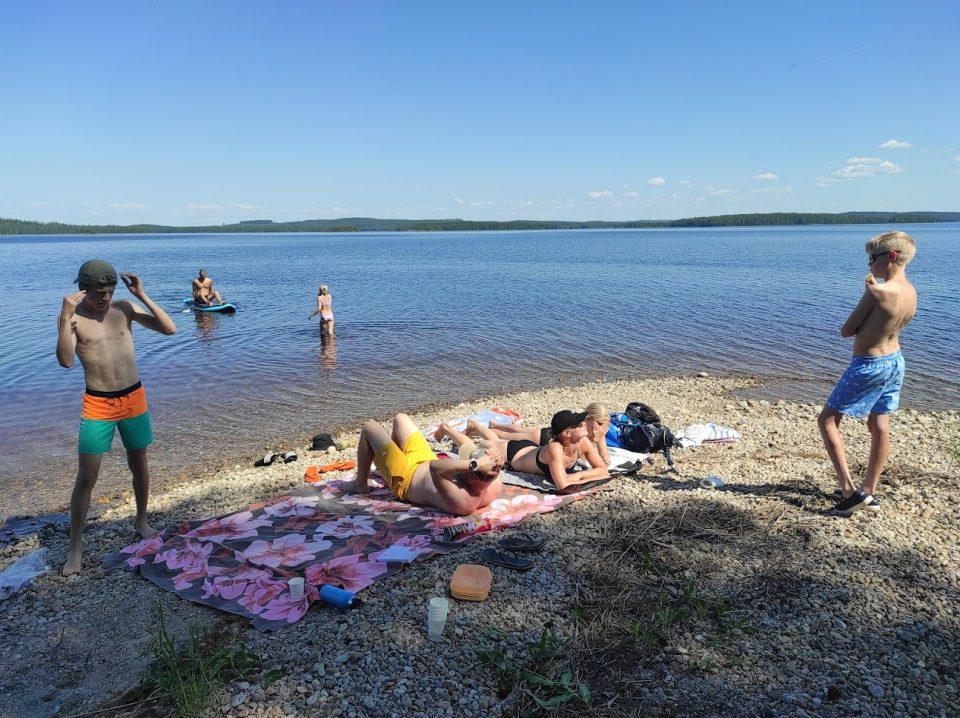 Päivä oli kaunis hellepäivä ja Pielinen oli lähes rasvatyyni. Upea keli siis meloa ja viettää päivää rannalla. Meillä oli mukana eväät ja vesi oli todella lämmintä. Vietimme päivän rannan tuntumassa aurinkoa ottaen ja vedessä pulikoiden – osa meistä kävi tutkimassa saarijonoa tarkemminkin.