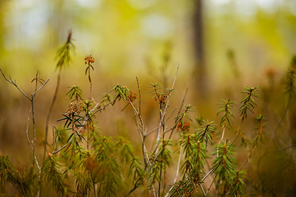 Suopursut aurinkoisen suon reunalla. Pehmeä tausta korostaa suopursuja. 200 mm F2.8 1/250s ISO 100.