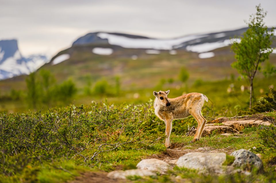 Poro ja lumiset tunturit taustalla. Tätä hetkeä olin odottanut ja laskeuduin kuvaamaan lähes maan tasolta, jotta tunturit tulivat sopivasti taustalle. Kamerassa oli asetuksissa varmuuden vuoksi korkeampi ISO-arvo, jos syntyi nopeaa liikettä 200 mm F2.8 1/3200s ISO 400.
