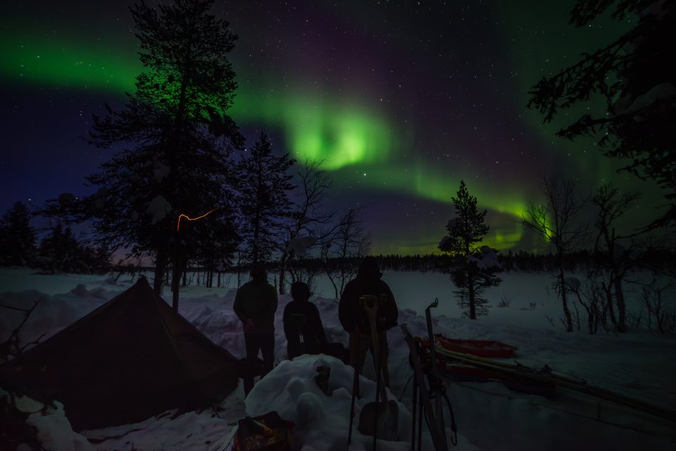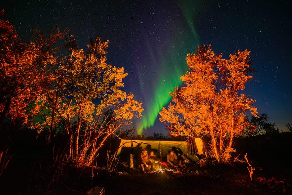 Leiriporukka ihailemassa öisiä revontulia. Hiukan nopeampi valotusaika olisi pysäyttänyt liikkeen paremmin. Kirkkain kohta on melkein palanut puhki. 14 mm F2.8 6s ISO 400.