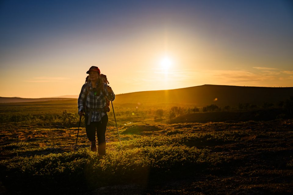 Vaeltaja vastavalossa. Vaelsimme keskiyön auringonpaisteessa. Minulla on valoherkkyyden takia pakko olla aurinkolasit päässä ja näen asiat usein erilailla lasien läpi. Muutin värimaailmaa jälkikäsittelyssä vastaamaan omia fiiliksiä. 50 mm F5.6 1/4000s ISO 100.