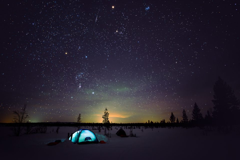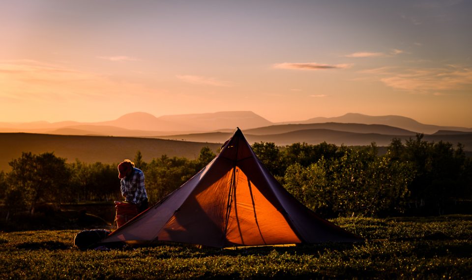 Keskiyön auringonpaiste, leirinpystytys vastavalossa. 46 mm F5.3 1/3200s ISO 100.