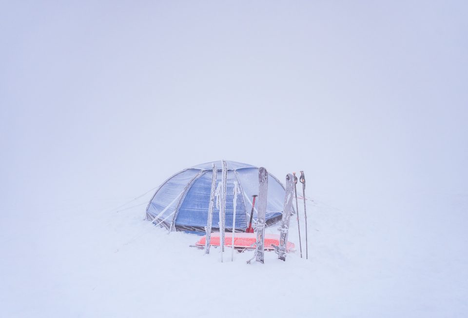Teltta whiteoutissa. Kameraan oli unohtunut iltakuvauksista ISO 800, vähempikin olisi riittänyt. 26 mm F4.2 1/6400s ISO 800.