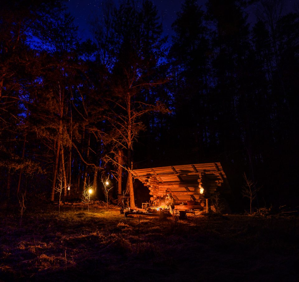 Kuksakuva samasta tilanteesta, kuin edellinen, nyt tautalla on enemmän tyhjää. Nuotio näkyy bokeh-palloina. 35 mm F1.4 1/100s ISO 100.