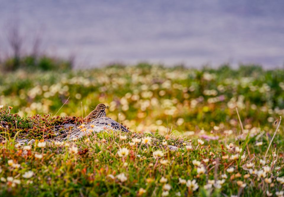 En tunne lintuja tarpeeksi hyvin, olisiko Lapinkirvinen? Lintu saalisti hyönteisiä kukkakedolla, kuvasin ihan maantasosta, jotta sain myös jäämeren taustalle ja linnulle hienomman taustan 200 mm F6.3 1/250s ISO 400.