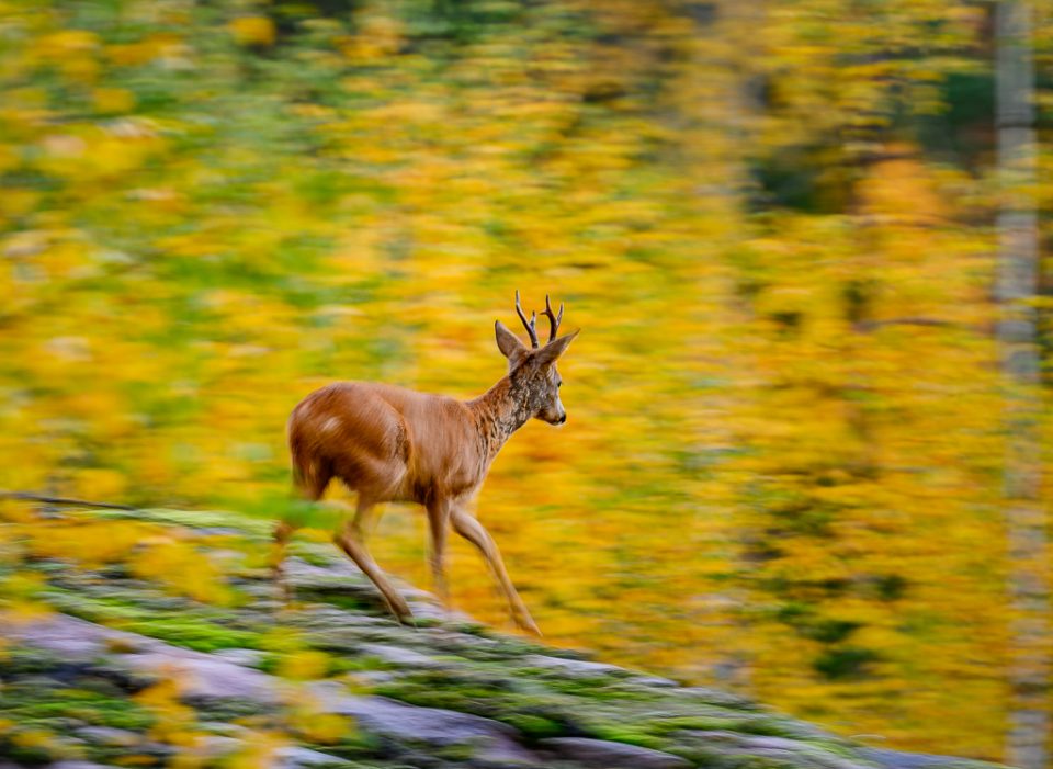 Metsäkaurispukki yllätti ja kamerassa oli väärät asetukset. Pannasin, eli käänsin kameraa juoksun suuntaan samalla kuvatessa ja pää tuli teräväksi, muuten malli ja tausta on epätarkka. Liike-epäterväyyttä ei pysty enää korjaamaan jälkeenpäin.