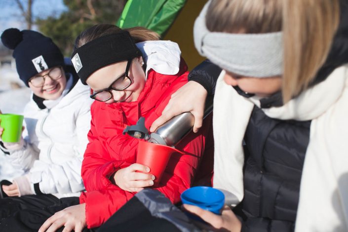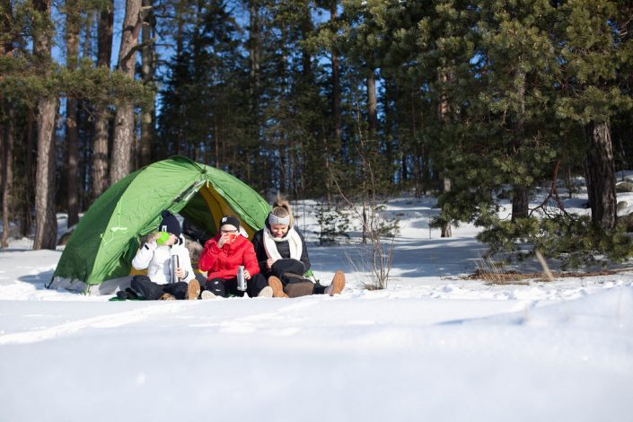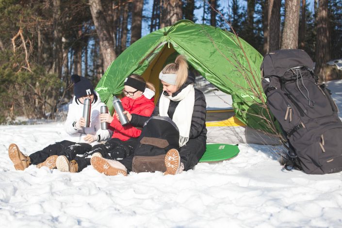 Vaatevalintojen suhteen saa käydä lasten kanssa aina pientä väittelyä. Miksi ulkohousut? Miksei nämä kengät käy? Viimeistään poluilla lapset ymmärtävät, miksi kannatti laittaa juuri ne vaatteet, joita suosittelimme. Ei mulla tule kylmä, enkä tarvitse erikseen taukovaatteita. Usein käyn kuitenkin vielä salaa sujauttamassa reppuihin ne puuttuvat varusteet, koska aina niitä tarvitaan.