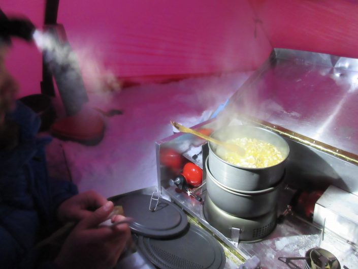 – Telttana Hilleberg Kaitum 3GT. Kaitum on ollut mukana monella reissulla ja osoittautunut maan mainioksi majoitteeksi. Tilava, kestävä ja helppo pystyttää. Kaksin liikuttaessa on kolmen hengen teltta juuri sopivan kokoinen, talvella tuppaa tarvitsemaan aina vähän enemmän tilaa. Myös vielä lujempitekoiset Black label -sarjan tunnelit, kuten Nammatj ja Keron ovat erinomaisia.