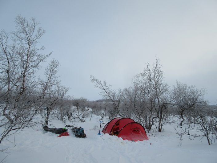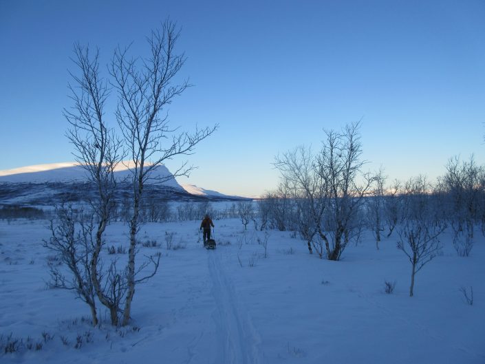 Oma perusajatukseni lyhyemmillä noin viikon mittaisilla talvivaelluksilla on se, että pakkaan mielummin vähän reilusti kuin vähän liian vähän tavaraa mukaan. Talviolosuhteet jo itsessään ovat kesään verrattuna monesti haastavammat, joten ei ole mitään syytä ottaa liian vähän vaatetta mukaan, palella juuri ja juuri rajoilla olevassa makuupussissa tai syödä liian vähän. Talviretkeilystä pitää ennen kaikkea nauttia, eikä kärvistellä! Ahkiota vedettäessä ei ole käytännössä mitään väliä, painaako sen sisältö 25 vai 30 kg. Rinkassa tämä voisi kyllä tuntua. Grammanviilaus on siis hyvä unohtaa ja panostaa mukavuuteen.