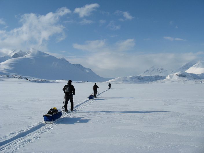 Oma perusajatukseni lyhyemmillä noin viikon mittaisilla talvivaelluksilla on se, että pakkaan mielummin vähän reilusti kuin vähän liian vähän tavaraa mukaan. Talviolosuhteet jo itsessään ovat kesään verrattuna monesti haastavammat, joten ei ole mitään syytä ottaa liian vähän vaatetta mukaan, palella juuri ja juuri rajoilla olevassa makuupussissa tai syödä liian vähän. Talviretkeilystä pitää ennen kaikkea nauttia, eikä kärvistellä! Ahkiota vedettäessä ei ole käytännössä mitään väliä, painaako sen sisältö 25 vai 30 kg. Rinkassa tämä voisi kyllä tuntua. Grammanviilaus on siis hyvä unohtaa ja panostaa mukavuuteen.