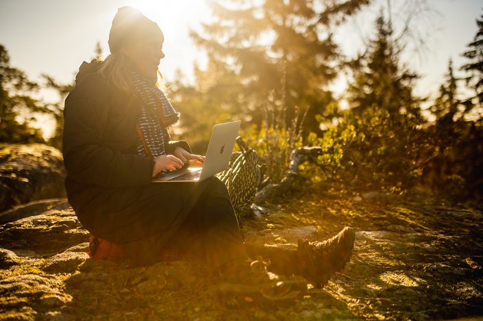 Tietysti jos itse töitäkin voi tehdä ulkona, niin sitä kannattaa kokeilla! Kylmät kelit tekevät omat haasteensa itse työntekijälle, kuin sähkölaitteiden akuille. Kevään lämmetessä voi siirtyä aina hetkeksi takapihalle, parvekkeelle tai lähimetsään läppärin kanssa.