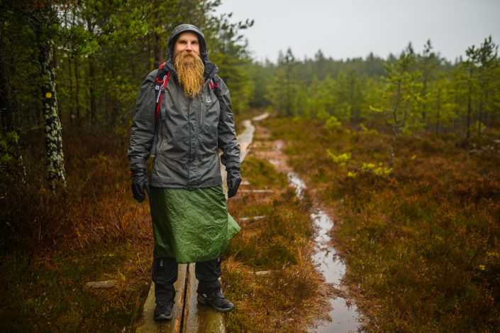 Mid-korkuinen vedenpitävä retkeilykenkä, säärystimet, sadehame tai -housut, vedenpitävä kuoritakki ja hanskat pitävät kuivana pahallakin kelillä.