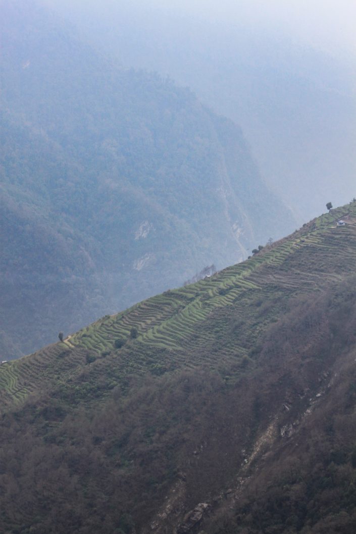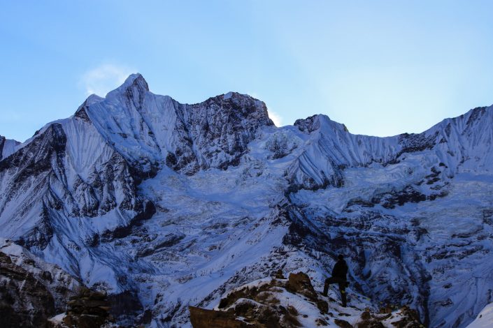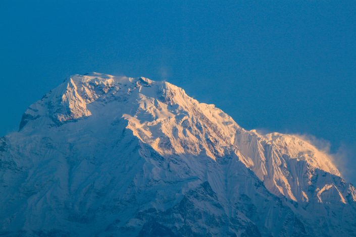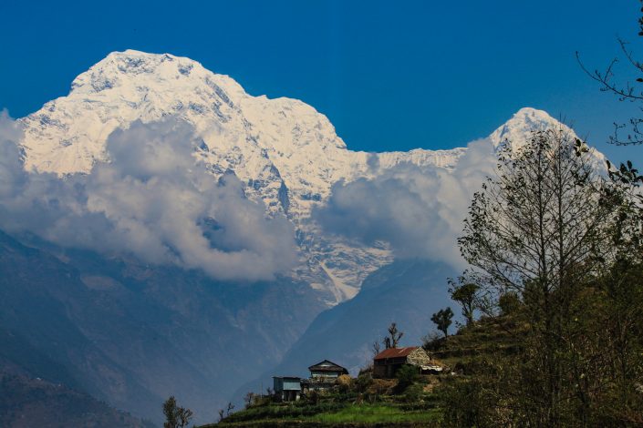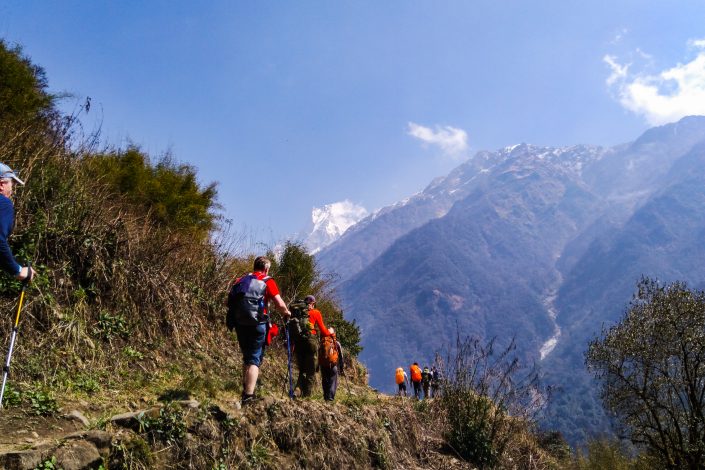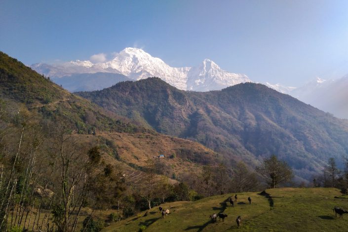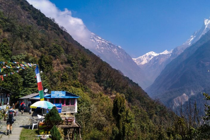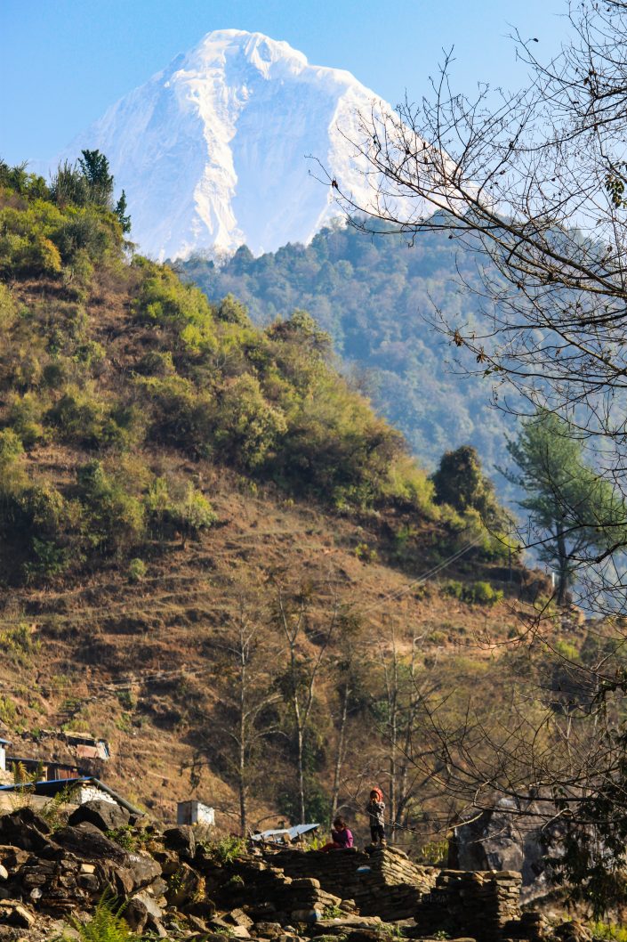 Aamut ovat monesti Himalajan vaelluksilla selkeitä ja vuoret parhaiten näkyvissä. Toisen vaelluspäivän aamuna maan mainio paikallisoppaamme Ngima Sherpa herättää meidät ennen auringonnousua. Majatalomme terassilta Ghandrukin kylästä avautui häikäisevän hieno näkymä edessä siintäville yli seitsemään kilometriin kohoaville vuorille. Ensimmäisen päivän ajan lumihuiput olivat vielä piileskelleet pilviverhon takana, mutta nyt ne paljastivat meille koko komeutensa. Aamuteetä hörppiessä saa ihaillen katsella, kuinka aurinko ensin osuu vuorten korkeimpiin huippuihin ja alkaa vähitellen pukea niitä uuden päivän loistoon.