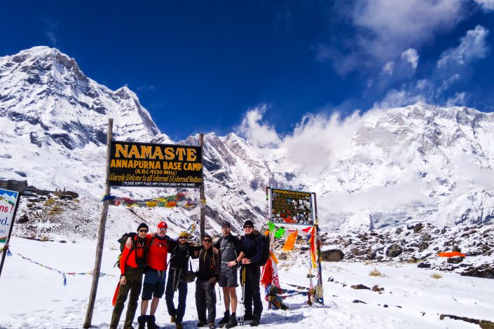 Vaelluksemme etenee suunnitellussa aikataulussa ja onneksemme vältymme kaikenlaiselta sairasteluilta. Viidentenä vaelluspäivänä saavumme koko ryhmän voimin tavoitteesseemme, Annapurnan eteläiseen perusleiriin. Seuraa onnitteluja ja ryhmäkuvien ottoa.