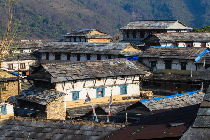Vanha Ghandruk. Ghandruk, ensimmäinen yöpaikkamme, on paikallisen gurung-väestön tärkein kaupunki.