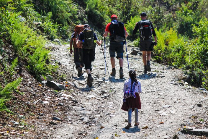 Pari ensimmäistä päivää polku kulkee halki idyllisten pikkukylien ja viljelysmaiden. Savu tupruttaa ulos pienten talojen hämäristä keittiöistä. Kylien asukkaat suorittavat arkiaskareitaan kyntäen pieniä peltojaan tai valmistaen ruokaa ohikulkeville vaeltajille. Lapsilauma juoksee kylän pääkadun poikki ja tervehtii ohikulkijoita iloisesti: “Namasteee!”. Ensimmäisen vaelluspäivän ajan polku sivuaa vielä aika-ajoin vuoristoon mutkittelevaa hiekkatietä, mutta jo toisena päivänä jää tie kokokaan taakse, eikä auton moottorin melua enää kantaudu korviin.