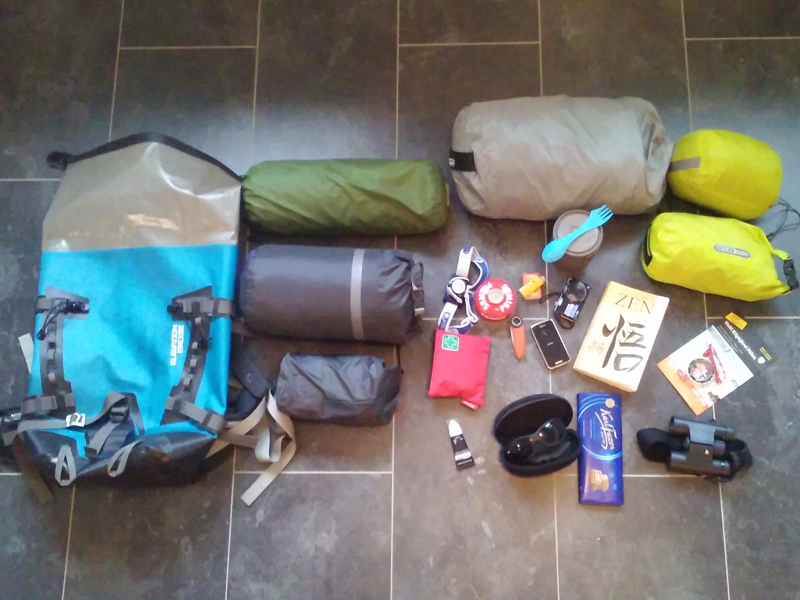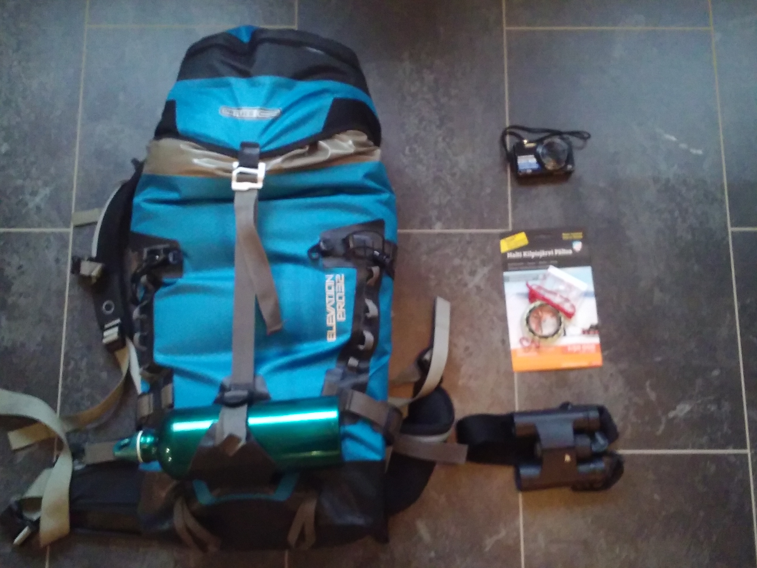 Kantolaitteenani toimi Ortliebin Elevation Pro 32. Nimensä mukaisesti repulla on tilavuutta 32 litraa ja sinne sai sijoitettua vaivatta kaikki muutaman päivän aikana tarvittavat varusteet. Reppu on vielä itsessään saumoja ja vetokejua myöten täysin vedenpitävä, joten erillistä sadesuojaa en tarvinnut. Repussa on vain yksi iso päätasku sekä pienempi tasku läpässä. Ulkokiinnikkeitä on runsaasti, jos sellaisia tarvitsee. Repusta löytyy siis kaikki mitä tarvitsee, eikä juuri mitään ylimääräistä. Toimii.