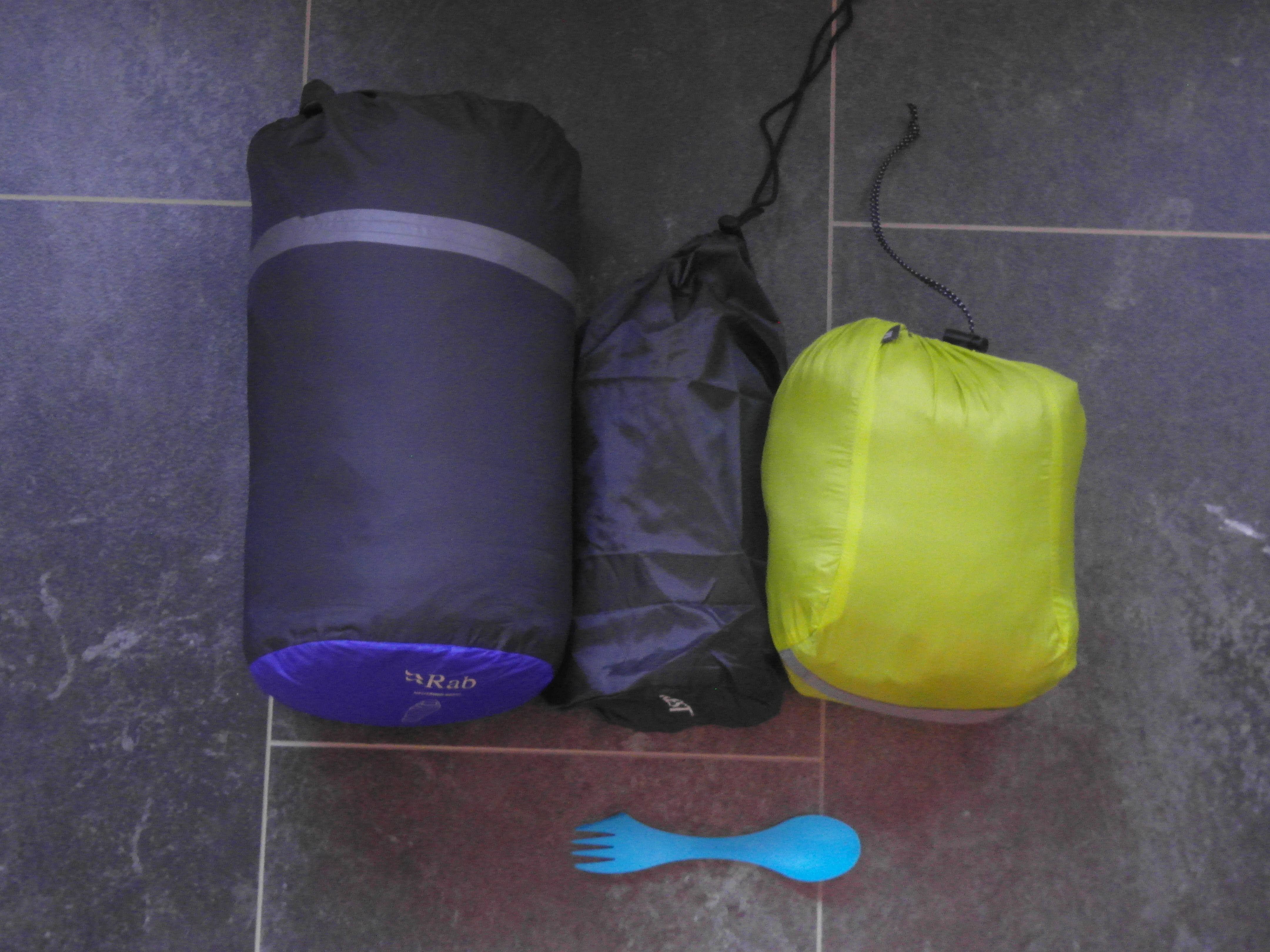 Vaatteista pakkaan reppuun huonon sään varalle kevyet Gore Tex Paclitea olevat kuoritakin ja –housut, yhden alusvaatekerran ja kaksi paria sukkia. Mukaan vielä pipo ja ohuet käsineet. Illat voivat syyskuussa jo olla viileitä, joten mukaan kannattaa mukavuussyistä pakata myös kevyt untuvatakki/liivi. Esimerkiksi Rabin Microlight Alpine soveltuu tehtävään mainiosti.