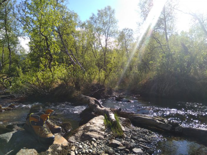 Salomon X-Alpit paistettelemassa päivää. Itselleni kevyemmillä vaelluksilla toimii hyvin kevyt, mutta suht jäykkäpohjainen vaelluskenkä, jossa on lyhyt varsi. Kenkä ei heti hörppää vettä märässä maassa ja tukee löysänilkkaisen kulkijan menoa epätasaisessa maastossa.