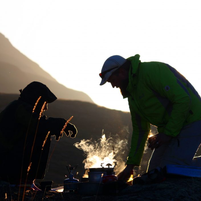 Ennen auringon nousuja kopistelemme jäähileitä teltan kankaasta. Elohopea painuu öisin selvästi pakkasen puolelle. Aamujen kohokohtia on odottaa hetkeä, jolloin uuden päivän auringon säteet kipuavat viereisen vuorenrinteen yli ja osuvat leiriin. Lämpö ja valo valtaavat kehon ja mielen. Uusi päivä ei voisi paremmin alkaa.