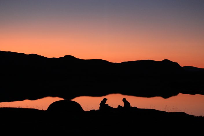 Illat ovat rauhallisia ja auringonlaskut tunnelmallisia. Viimeiset säteet viipyilevät pitkään ympäröivillä lumihuipuilla, kunnes lopulta vaipuvat kukkuloiden taakse lepäämään. Ilma viilenee ja päälle saa vetää lämpimämmän takin. Taivas syttyy täyteen tähtiä, joista iltapalaa keitellessä tunnistelemme tuttuja kuvioita.