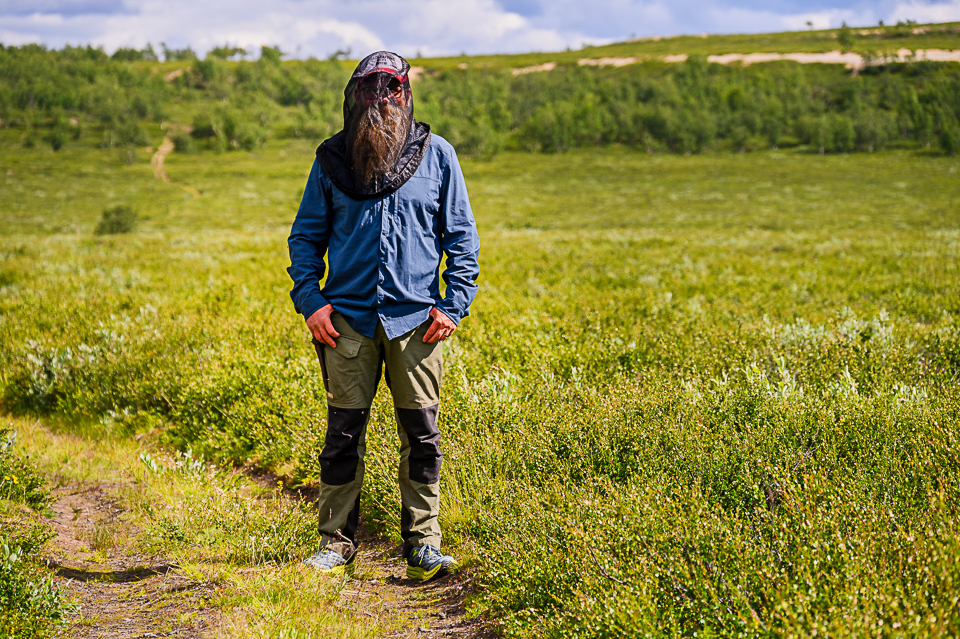 Suojavarustus räkkäaikaan Lapissa. Hyönteissuojapaita + tiheäkankaiset housut (Sasta Peski), vedenpitävät sukat (Bridgedale) ja hyttyshuppu (Cocoon). Tämä setti toimi todella hyvin, vaikka sääskiä oli ennätysmäärä. Kämmenet ovat ilman suojaa, mutta niistä on helppoa hätyytellä sääsket pois.