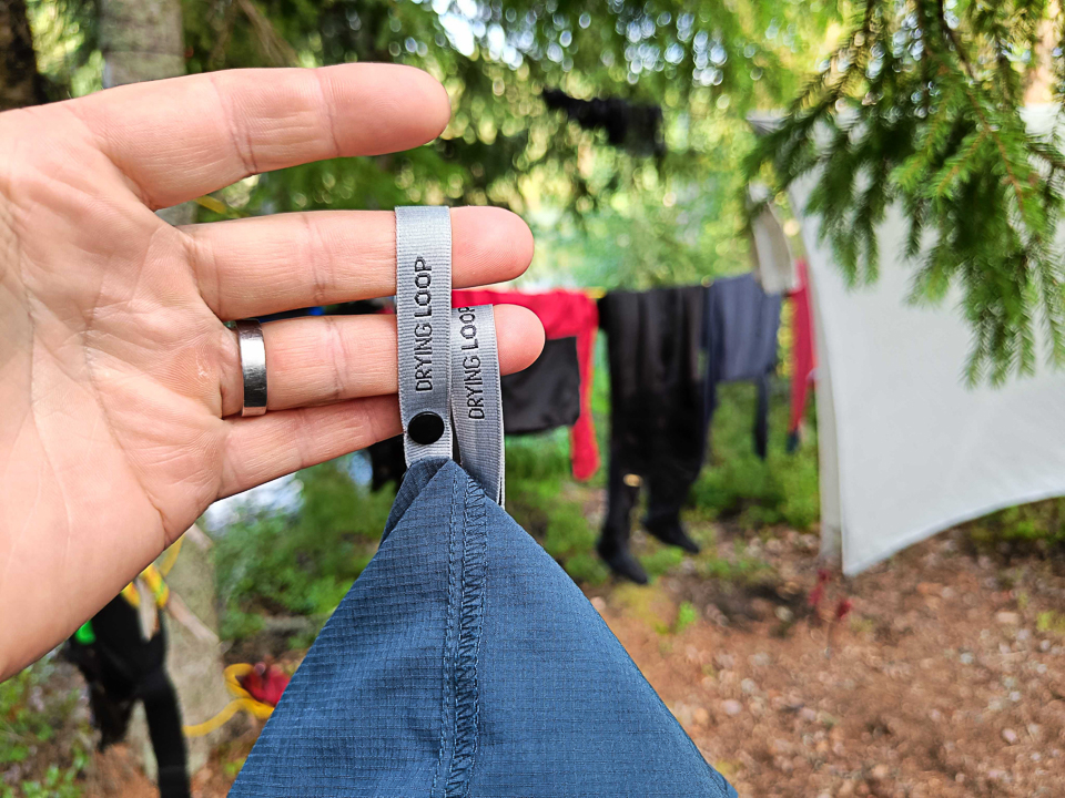 Paidan sisällä on kaksi lenkkiä, joilla sen saa helposti kuivumaan tai tuulettumaan. En pese vaellusvaatteita kovin usein, ellei ole pakko. Tuuletan vaatteet useamman kerran päivän aikana ja tämä yleensä riittää, jos vaatteissa ei ole tahroja.