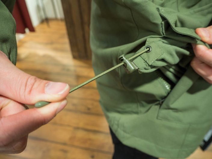“Sivutaskuista löytyvällä kiristysnauhalla voidaan viimeistellä takin istuvuus lantion alueelta.”