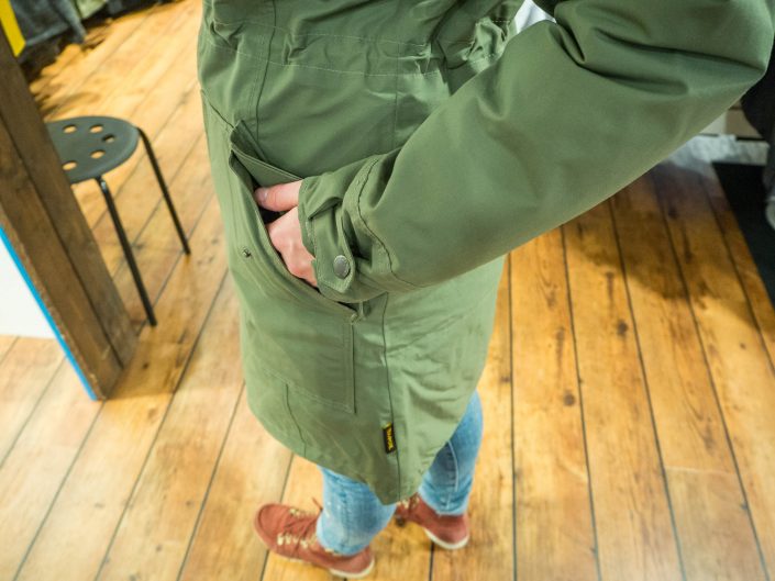 “Kätevä yksityiskohta on kaksisuuntainen vetoketju, eli vetoketjun voi aukaista myös alhaalta päin takin ollessa ylhäältä kiinni. Näin takki luo tarvittaessa lisää liikkumavapautta jaloille samalla kuitenkin lämmittäen lantiota ja ylävartaloa.”