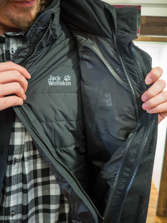 “Miesten versio Jack Wolfskinin kätevästä 3 in 1 -yhdistelmätakista. Viking Sky -yhdistelmätakki pitää sisällään siis kuvassa näkyvän tyylikkään mustan kuoritakin ja sen alta löytyvän lämpimän vuoritakin. Kumpaakin näitä on mahdollista käyttää myös omina takkeinaan.” (Kuvan takki on kokoa L ja mallilla pituutta 189cm).