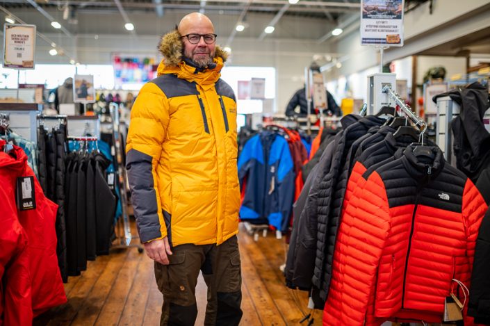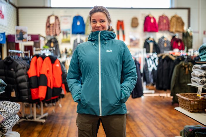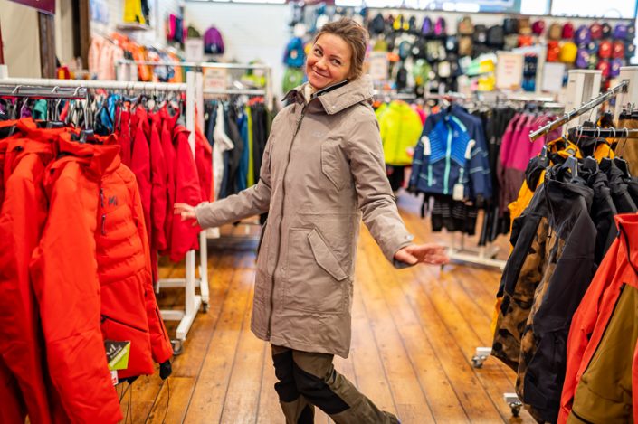 Kuninkojan myymäläpäällikkömme, Esan yllä on muhkea The Cook Parka, laadukkaalla fill power 700 -untuvatäytteellä. Tällä takilla tulee sisällä äkkiä kuuma, Microguard Silver -materiaali säteilee ruuminlämpöä takaisin kehoa kohti ja takki pitää lämpimänä kovillakin pakkasilla.