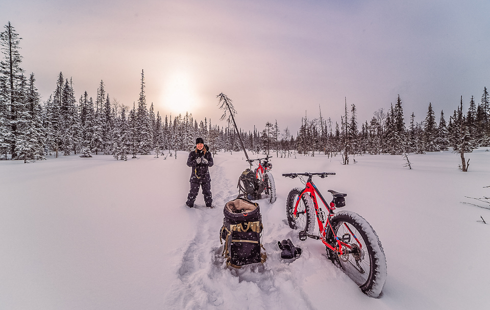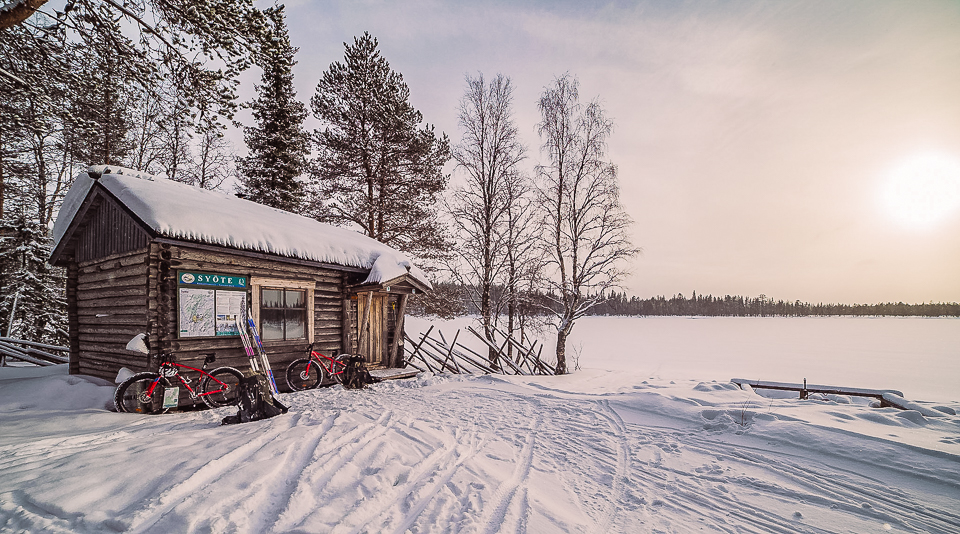 Vuokrasin hotellilta minulle ja vaimolleni läskipyörät ja poljimme Rytituvalle (varaustupa) yöksi. Tätä pidemmälle ei pyörällä reittiä pitkin pääse ja en ole varma tehdäänkö reitti vielä tänne asti, koska reittikartan mukaan se menee nykyään vain Toraslammelle asti. Rytituvalle tuli matkaa Iso-Syötteen hotellilta reilut 25 km, mikä oli pitkä rykäisi rinkka selässä pyöräillen lumimyrskyssä.