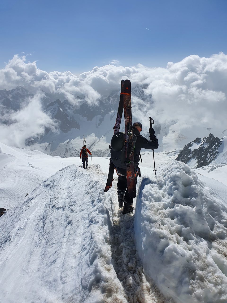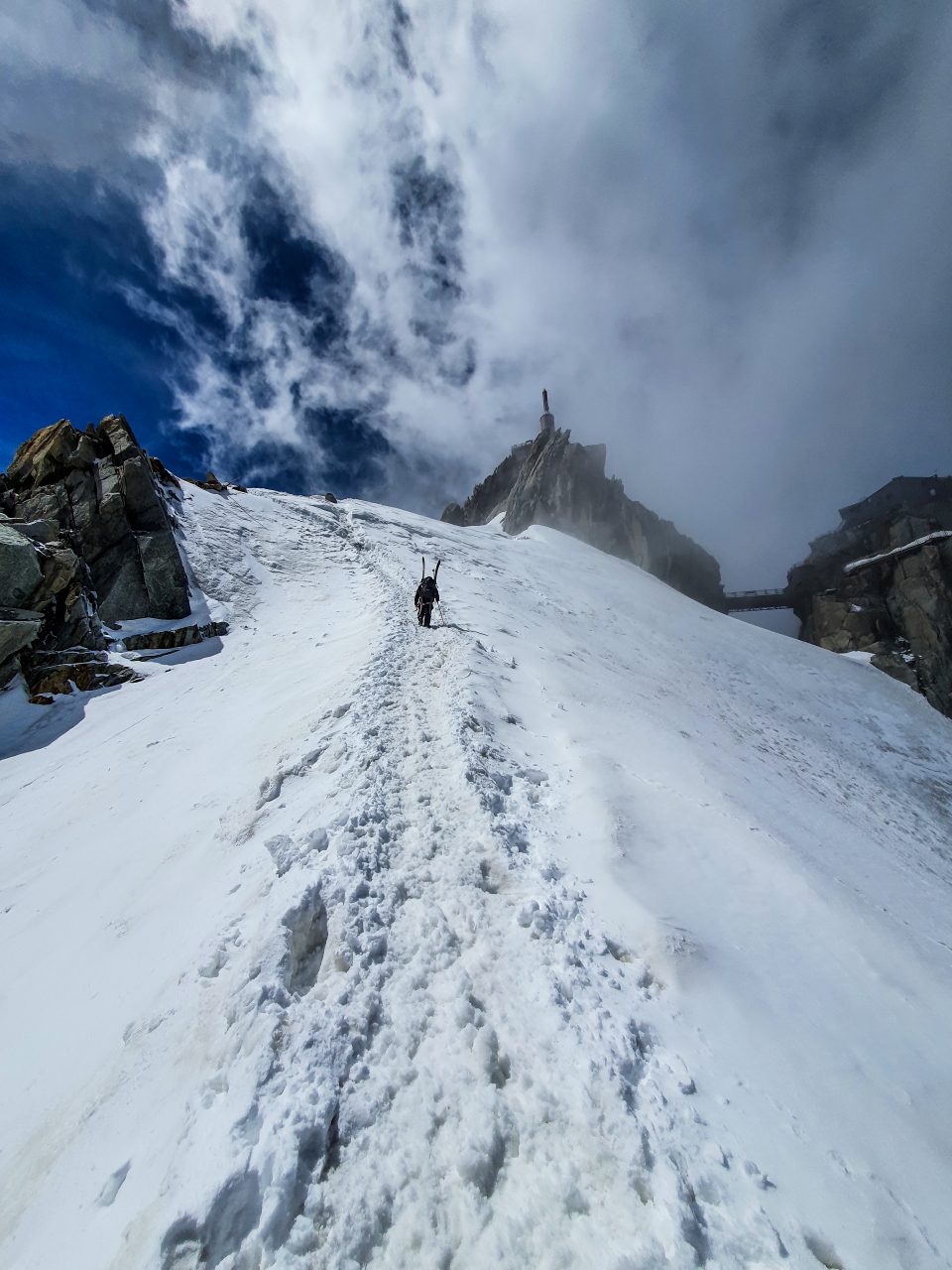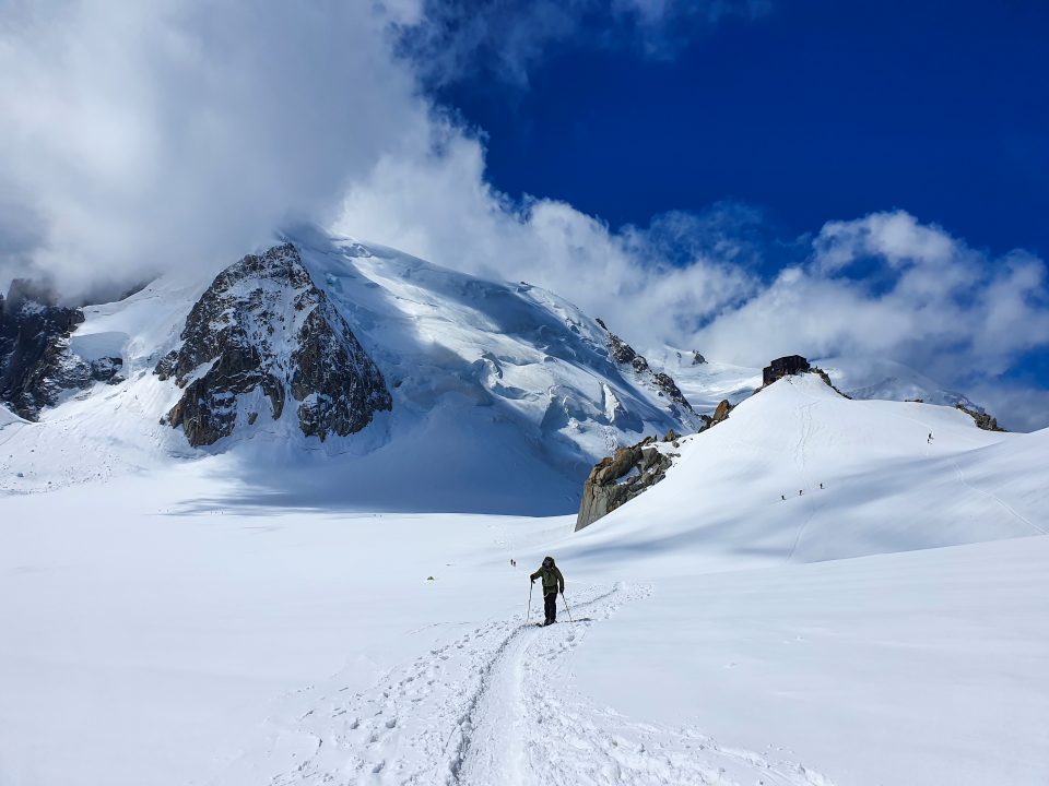 Katsoimme ahkerasti lumitilannetta Italian Gran Paradisolla ja vaikka välillä näytti, että lumi riittäisi laskemiseen, oli sitä kuitenkin jyrkän ja jäisen pohjan päällä liian vähän. Siksi pääkohde saisi jäädä toiseen kertaan ja keskityimme laskuhommiin Aiguille du Midin hissiltä, johon lähdettiin yhdessä paikallisen Niko Pettersonin ja Blumin kanssa.