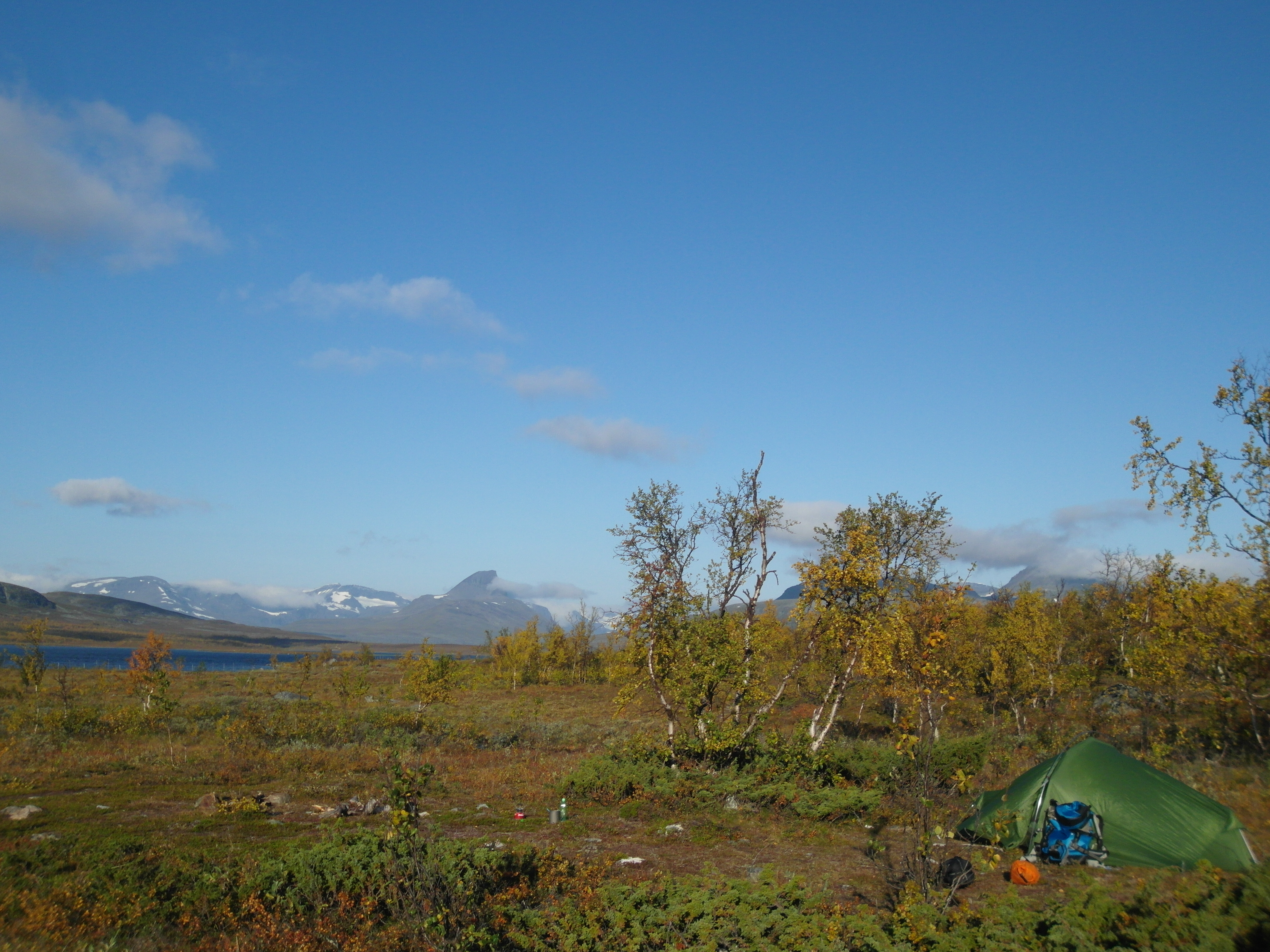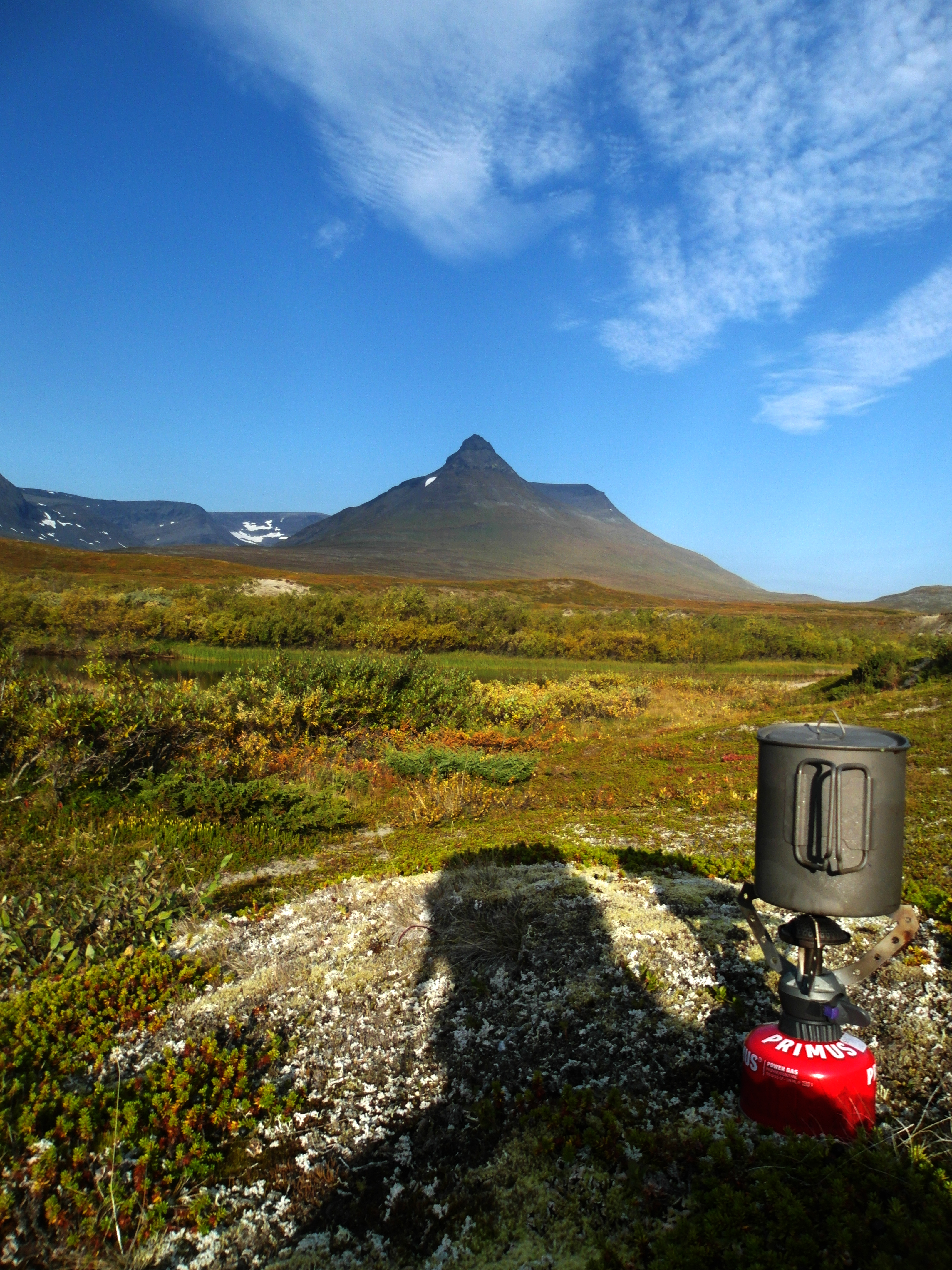 Lähdin liikkeelle myöhään iltapäivällä ja saavutin Kuohkimajärvellä sijaitsevan autiotuvan illansuussa. Se oli tällä kertaa kuitenkin sen verran kansoitettu, että jatkoin matkaani vielä pari kilometriä Norjan puolella ja pystytin leirin vähän sivuun polulta tunturikoivujen katveeseen pienen puron varteen. Iltapalaa keitellessä ja pimenevää tunturimaisemaa katsellessa sielu sai taas levätä. Kuuntelin kaasukeittimen pöhinää, josta on vuosien mittaan tullut minulle hyvin rauhoittava ääni. Alitajuisesti sen assosioi reissussa oloon ja tietää, että silloin asiat eivät voi olla kovin kehnosti. Iltapalan valmistuttua kuului enää vain tuulen huminaa, joka sekin oli varsin rauhoittavaa. Loikoilin pitkään teltan ulkopuolella ja nautin hyvästä ruoasta ja luonnon rauhasta. Maiseman pimennyttyä vetäydyin sitten telttaan nauttimaan vielä hyvästä kirjallisuudesta otsalampun valossa. Myöhemmin yhä voimistunut tuuli säesti minut uneen.