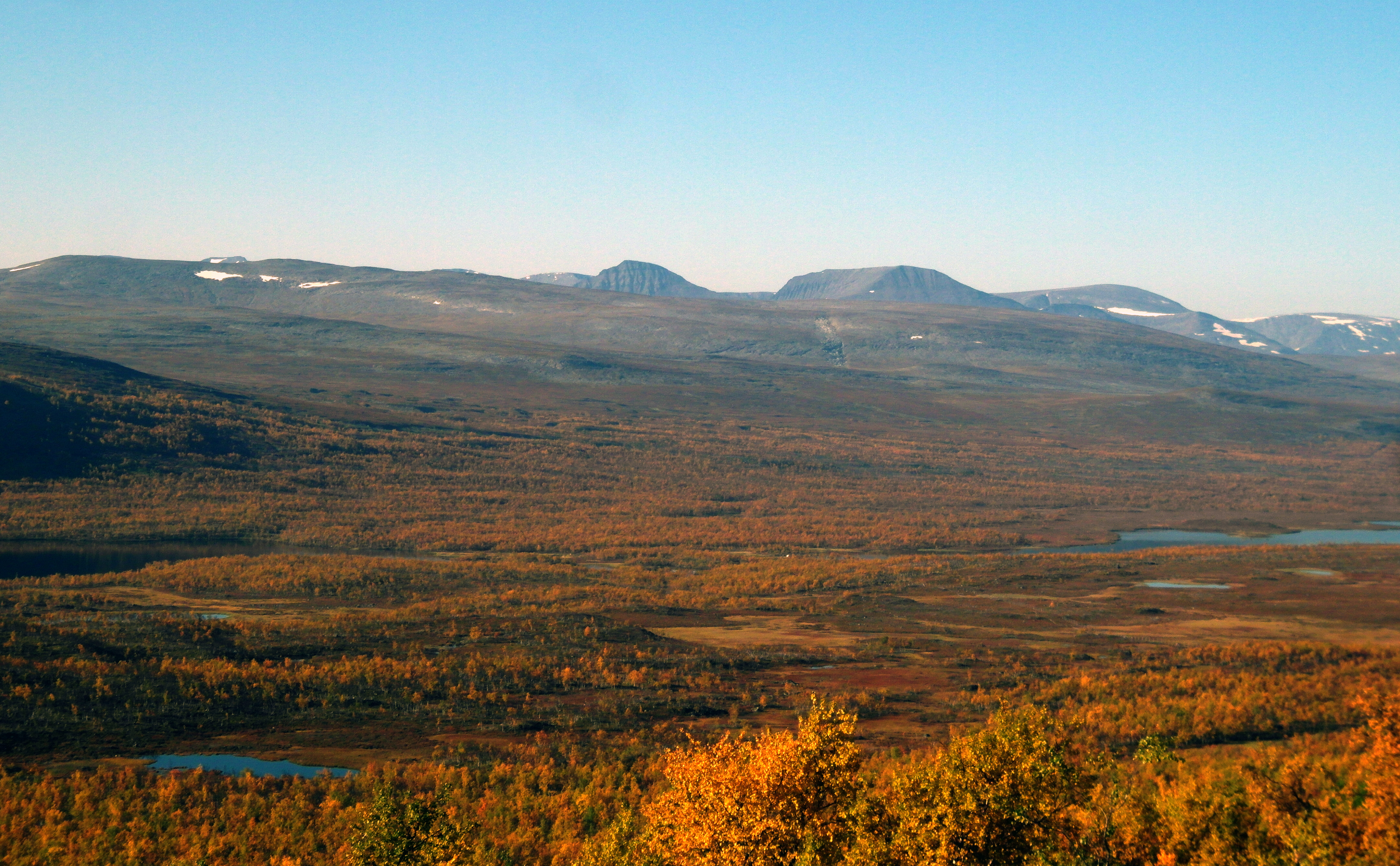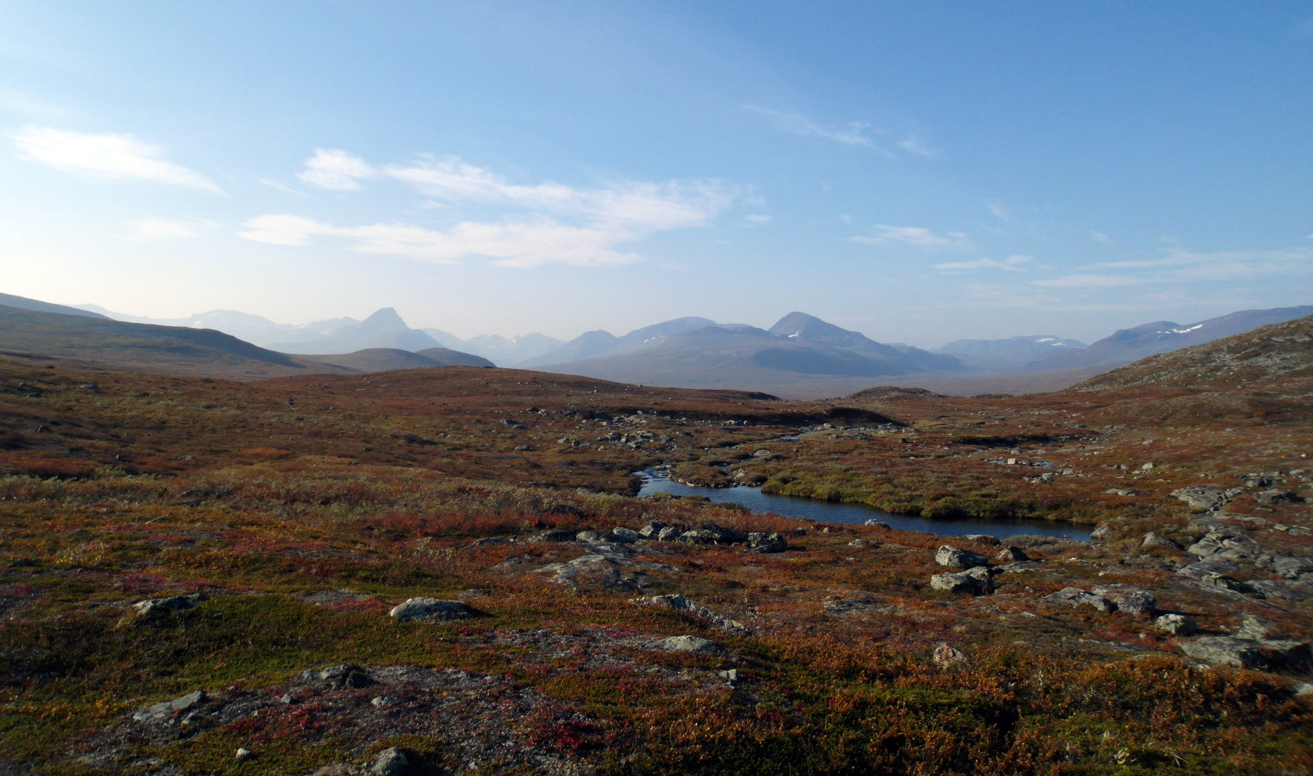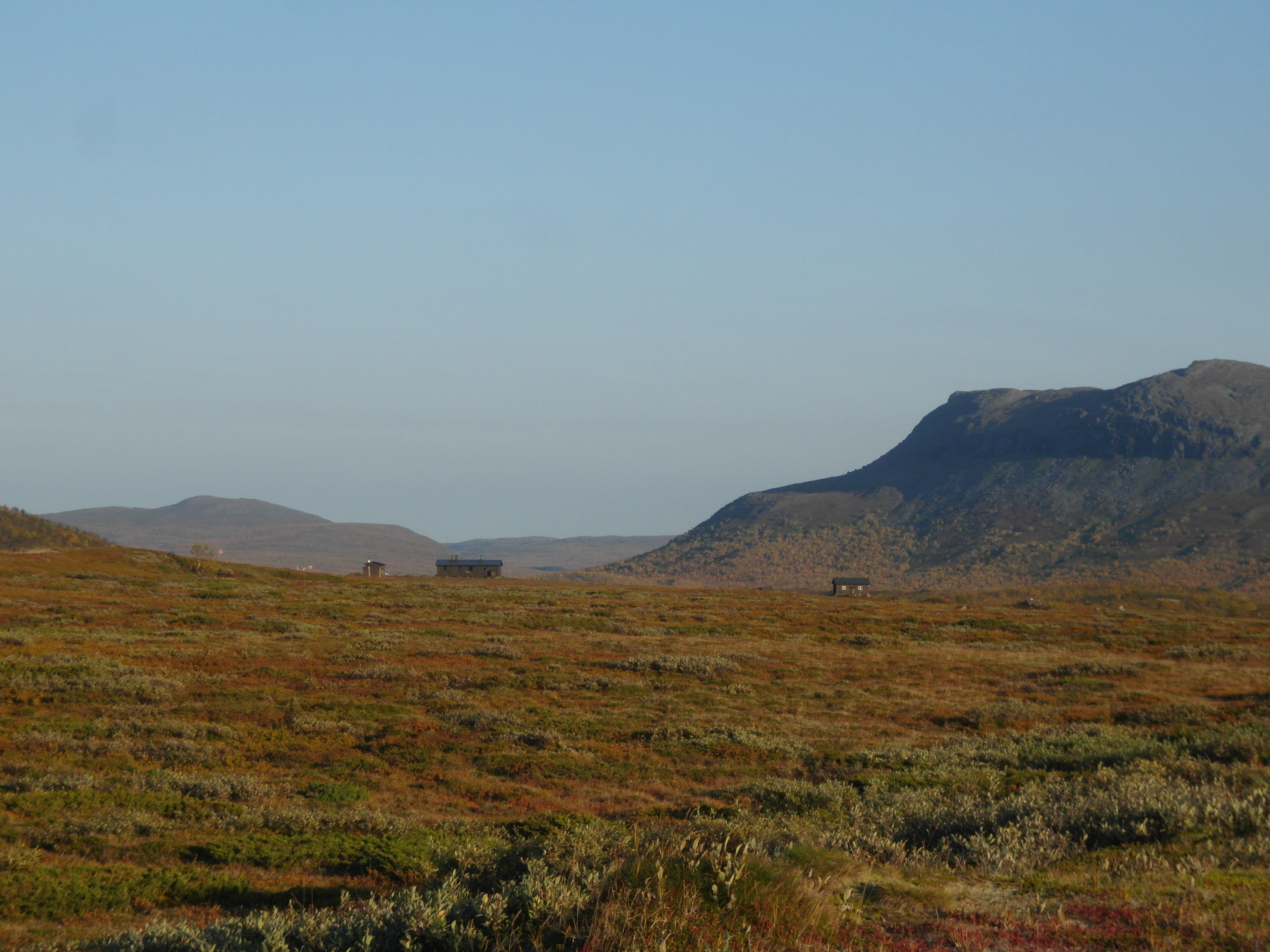 Seuraavana päivänä sää oli täydellinen. Kävelin päivän aikana Gappohyttan kautta Ruotsin puolelle Pältsastuganin lähistöön. Polkua oli helppo seurata, eikä suunnistamiseen tarvinnut sen enempää keskittyä. Niinpä kaiken huomion pystyi keskittämään ympärillä aukeaviin jylhiin maisemiin. Alkuun näyttämöä hallitsi Norjan puolella komea Barras-tunturi, joka oikein kutsui nousemaan rinteilleen. Nyt aikaa oli kuitenkin niin vähän, että huiputtaminen piti jättää ensi kertaan.